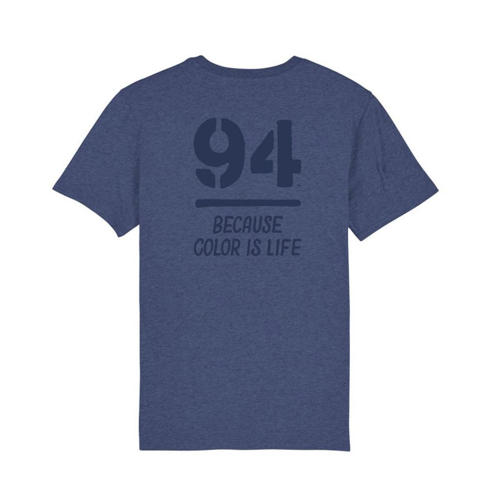 Camiseta unisex, ecológica, inspirada en el diseño de los sprays MTN 94. Incorpora dos estampados del logotipo 94: uno en el pectoral izquierdo y otro más grande en la espalda, junto a la frase “Because Color Is Life”.