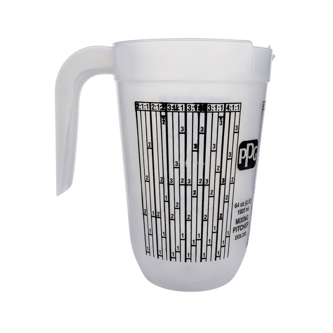 Recipiente tipo jarra con graduaciones utilizado para medir y mezclar productos de pintura automotriz con mayor volumen. Permite una preparación más precisa y práctica de los materiales en procesos de repintado.