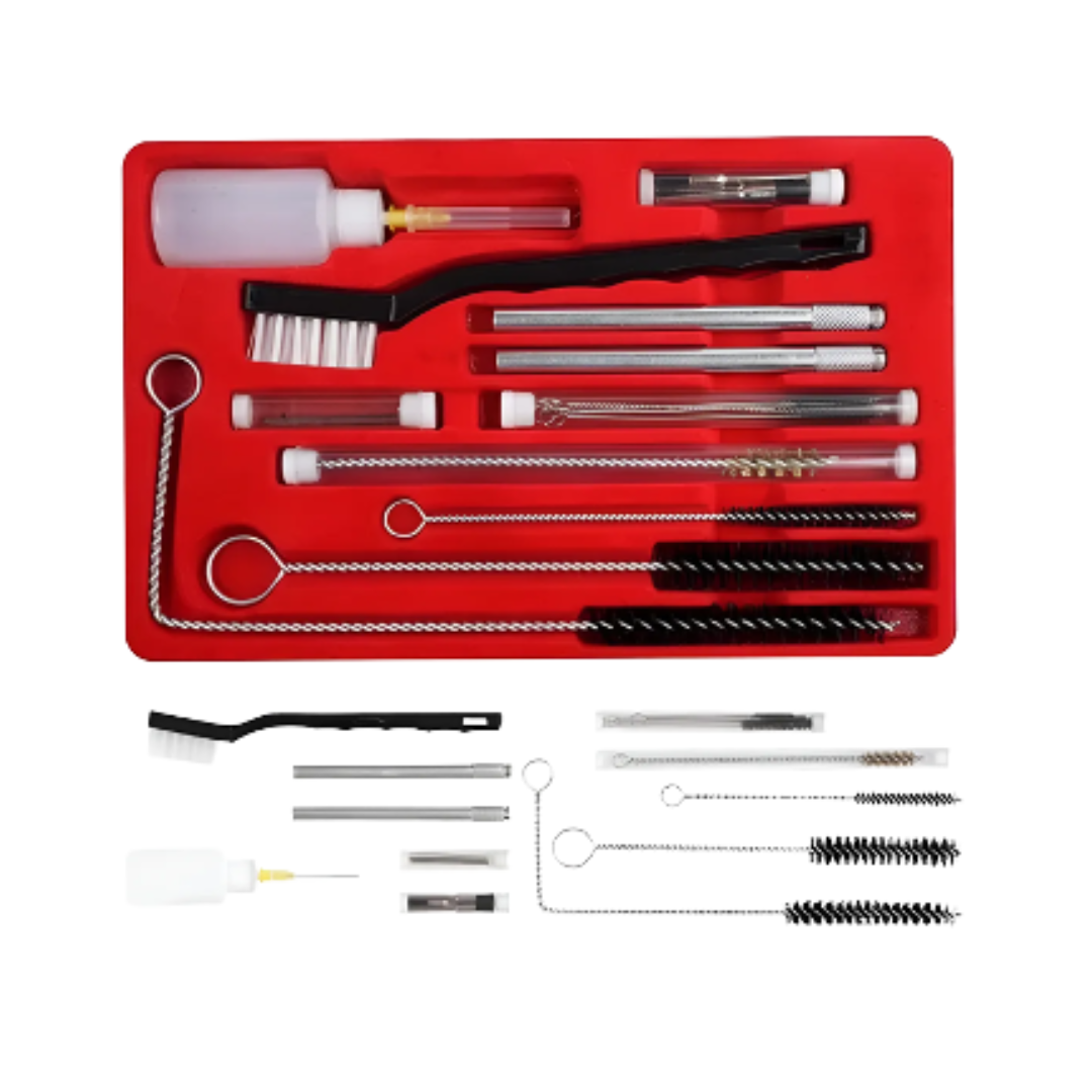 Conjunto de herramientas organizado en estuche diseñado para la limpieza y conservación de pistolas de aplicación. Permite remover residuos de recubrimiento en conductos y componentes internos, ayudando a mantener el funcionamiento óptimo y prolongar la vida útil del equipo.