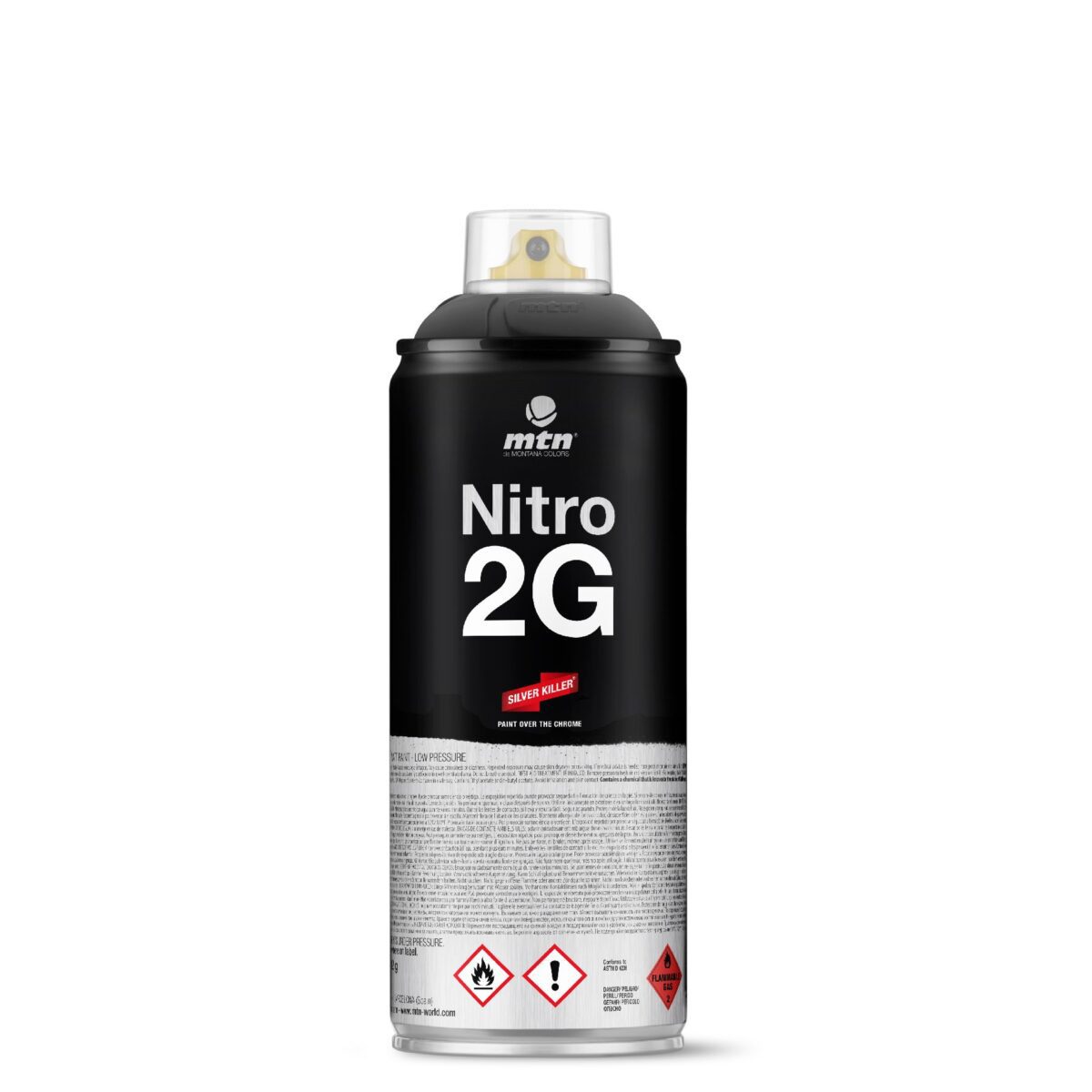 Nitro 2G es una pintura acrílica en aerosol a base de disolvente de excepcional calidad, disponible en negro mate. Está especialmente diseñada para usarse sobre pigmento de aluminio (Silver Killer) y, gracias a sus características, también puede utilizarse como capa de acabado.